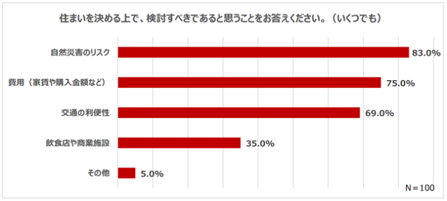 ジャパンホームシールド(JHS、東京都墨田区)はこのほど、全国20~60代の男女100名を対象に実施した「地盤に関する意識調査」の結果を発表した。それによると、住む場所を決める際に検討すべき点は「自然災害のリスク」が83%となり、「費用(家賃や購入金額など)」75%や「交通の利便性」69%を上回っていることがわかった。