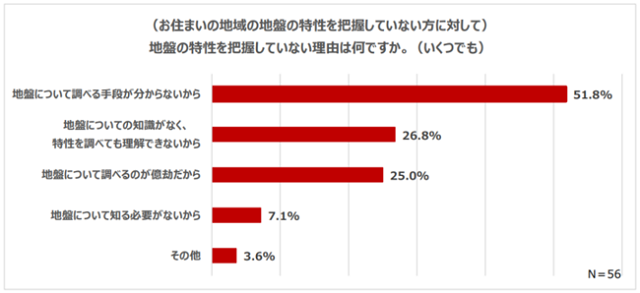 一方、住んでいる地域の地盤の特性を把握している人は44%にとどまっており、把握していない人の87.5%が「住まいの地域の地盤の特性を知りたい」と回答。把握していない理由として「地盤について調べる手段が分からないから」(51.8%)、「地盤についての知識がなく、特性を調べても理解できないから」(26.8%)などが挙げられている。