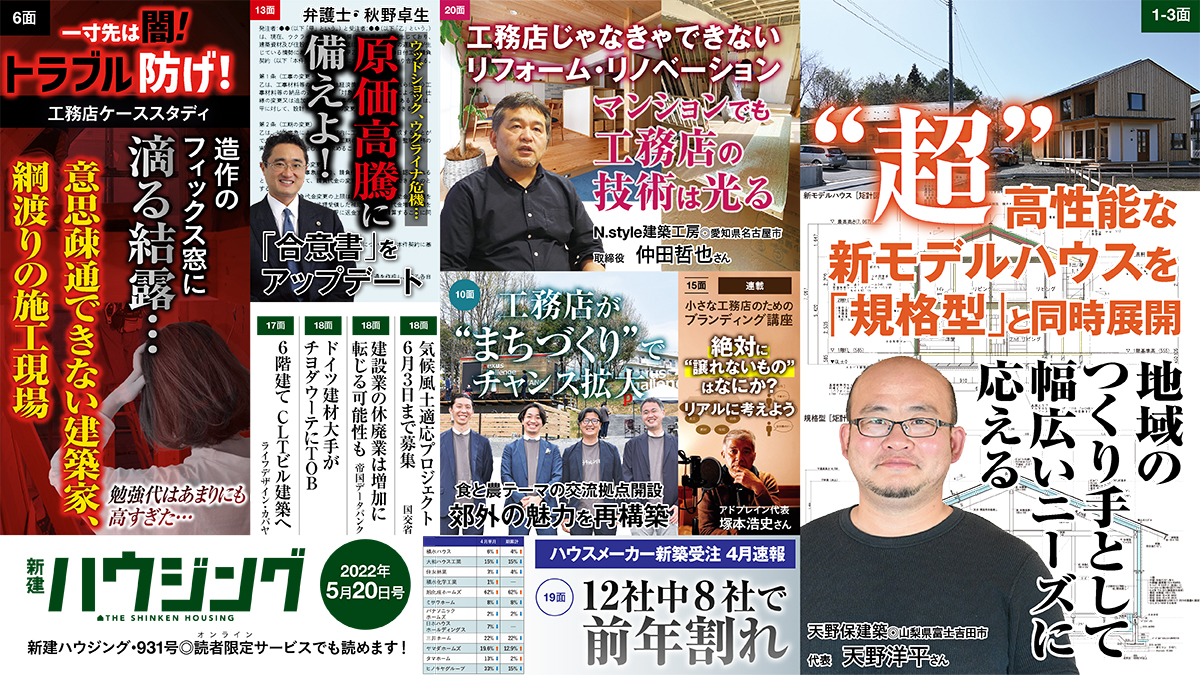 5月20日発行の新建ハウジングのトップ記事では、天野保建築(山梨県富士吉田市)の新モデルハウスにフォーカスします。同社は4月、HEAT20・G3超(省エネ基準の地域区分4)の断熱性能を備え、 同社の事務所と代表の天野洋平さんの自邸を兼ねるモデルハウスを完成させました。