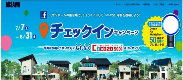 ミサワホーム(東京都新宿区)は7月7日~8月31日、全国220カ所の住宅展示場において「Facebookチェックインキャンペーン」を開催する。