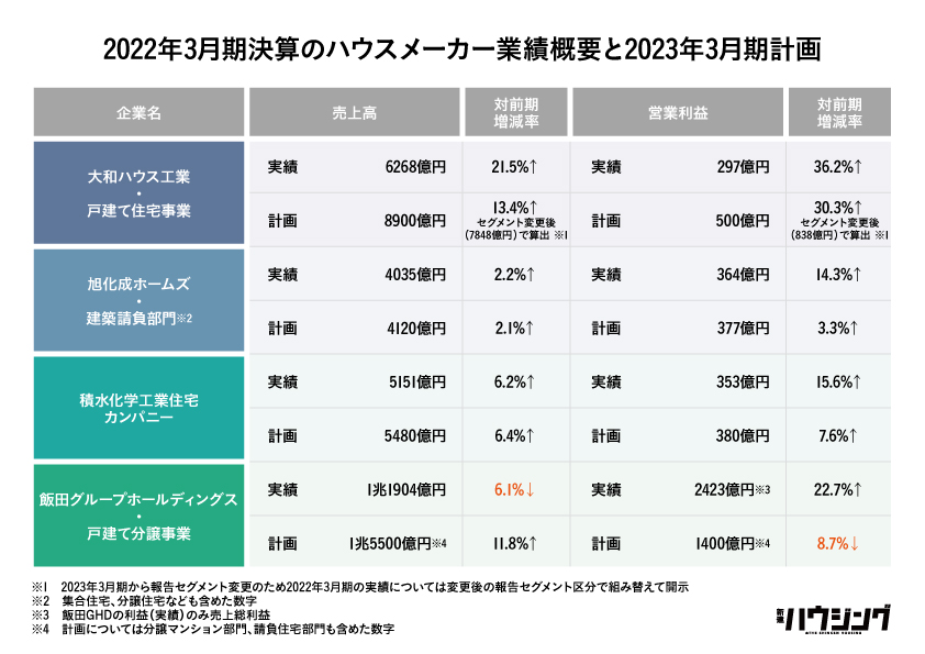 大手ハウスメーカー4社(大和ハウス工業、旭化成ホームズ、積水化学工業、飯田グループホールディングス)の2022年3月期決算概要と今期の業績予想が出揃った。