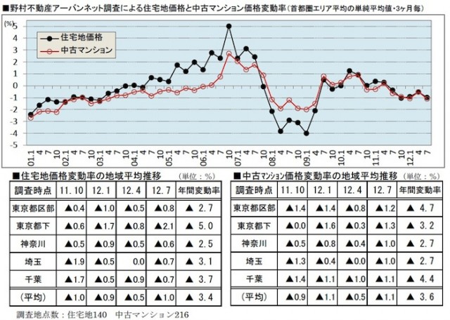 野村不動産アーバンネット(東京都新宿区)は、2012年7月1日時点の首都圏の「住宅地価格動向」「中古マンション価格動向」の調査を実施し、その結果をまとめた。