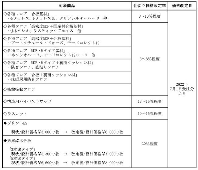 ◆プリントES、天然銘木合板は、2022年7月1日付で設計価格も併せて改定する