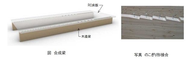 木質梁そのものに凹凸をつけRC床版とつなげる「のこぎり形接合」による構法。木とコンクリートの圧縮強度が近い特性を活かしお互いを強固に接合させることができる。RC床版が木造梁の剛性を高めるため、鉄骨造とコンクリートスラブによる床と同様の揺れにくさを実現した。梁の長さは従来の倍の約12mのロングスパンを実現するほか、梁せい(梁の高さ)を非合成梁と比較して約4分の3の90cmに抑えることが可能。これにより、中大規模木造建築の広い床面積と、建物の階数増加に対応できるようになった。高層化の際に増床につなげられるほか、耐火被覆面積の削減や建築費削減が可能になるとしている。