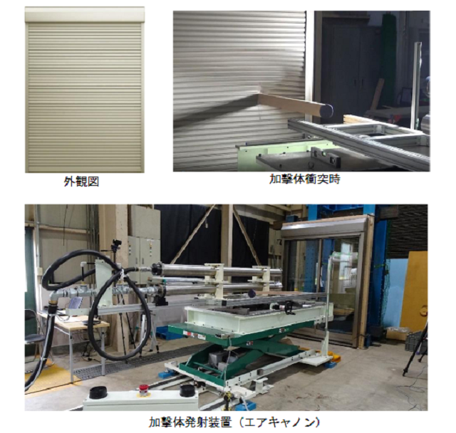 BL認定基準では、台風による飛来物を想定した加撃体衝突試験を行い、シャッターカーテンに貫通または孔(開口)が生じないこと、シャッター裏の窓ガラスが割れないことを要求。「屋根瓦の破片相当」以上の飛来物衝突に対して安全性をもつものを認定の対象としている。