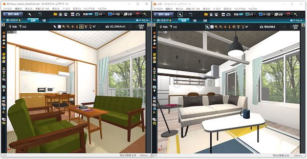 リフォームのビフォーとアフターや、A案とB案のイメージを作成し、同じ視点で見比べることができる2画面リンク機能を搭載。