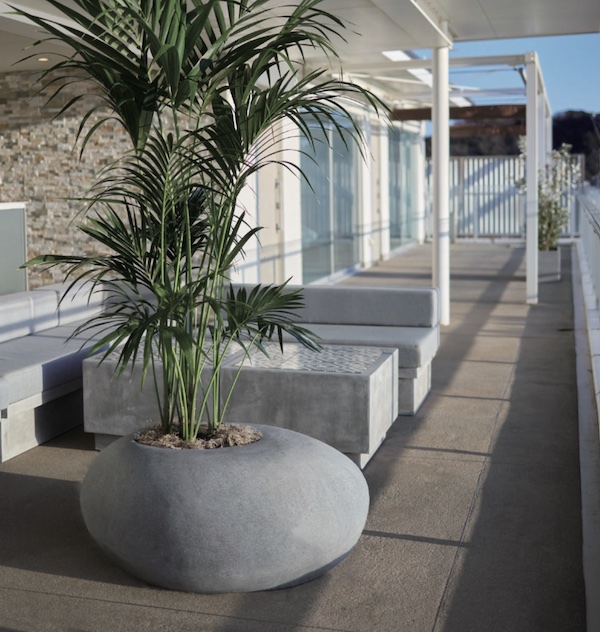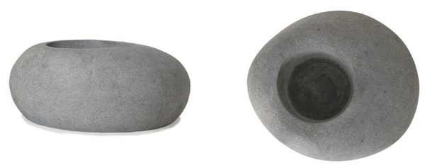 FRPと石粒をミックスした素材を使い、自然な丸石形状に見えるようシェイプを重ね、緩やかな傾斜をつけて腰掛けられるスペースを確保した屋内外向けのプランター(鉢カバー)。