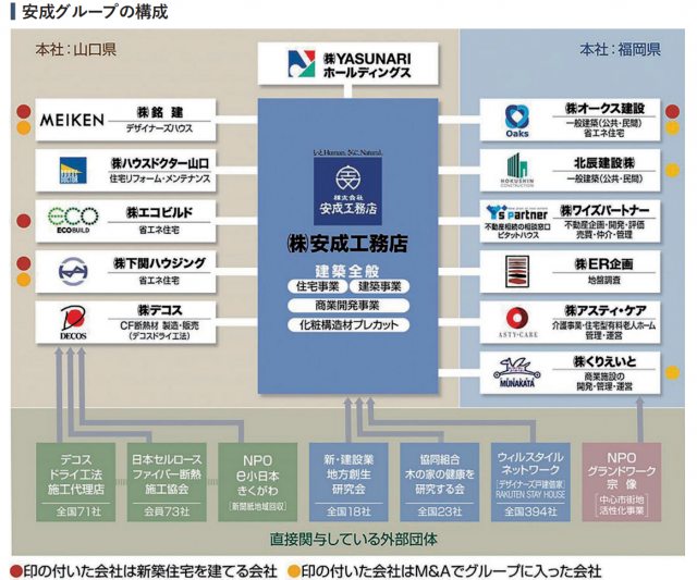 ◉安成グループは13社。福岡県に本社を置く会社が6社、山口県が7社。そのうち新築住宅を手掛ける会社は5社。山口県の安成工務店、銘建、エコビルド、下関ハウジング。福岡のオークス建設