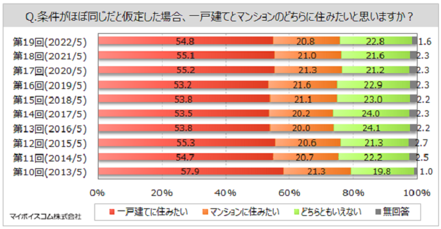 マンション購入経験者・意向者(全体の約3割)に対し、価格や仕様、立地などの条件がほぼ同じ場合、一戸建てとマンションのどちらに住みたいかを聞いたところ、「一戸建て」は54.8%、「マンション」は20.8%だった。東北・中部では「一戸建て」が約65%となっている。一戸建てに住みたい理由は「駐車場代がかからない」「庭を造ることができる」「管理組合などのわずらわしさがない」などが上位に。マンションに住みたい理由としては、「セキュリティが充実」「設備のメンテナンス・清掃などの負担が少ない」「気密性、断熱性が高い」が上位になった。