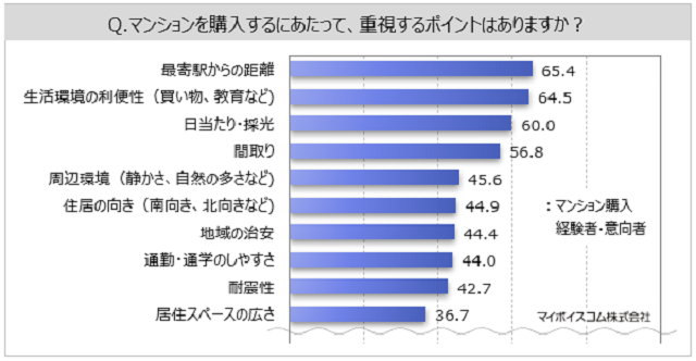 マンション購入経験者・意向者に対し、マンション購入時の重視点を聞いたところ、「最寄駅からの距離」が最も多く65.4%だった。次いで「生活環境の利便性」64.5%、「日当たり・採光」が60%と続いた。「生活環境の利便性」「地域の治安」「間取り」「収納スペース」は女性が高く、「通勤・通学のしやすさ」は男性50代や女性若年層で高くなっている。