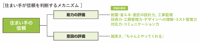 でも、評価のよりどころも極めて少ないのが現状だ。世の中には、能力をラベル化する取り組みが多数あるが、それだけで住まい手は満足しない。順法であることや、実績としての数字は、能力としては最低限の情報。住まい手が事業者の信頼を判断するには十分ではない。