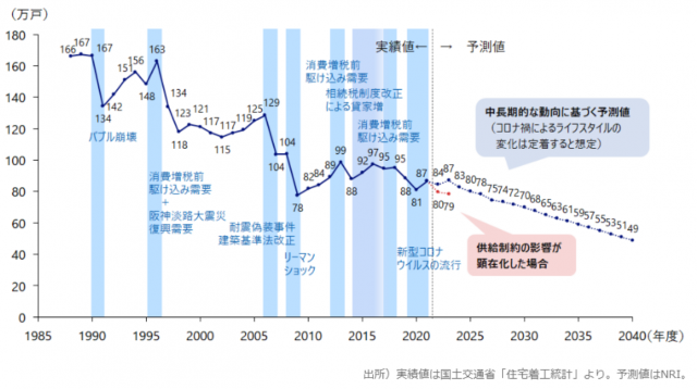 また、中長期的な動向に基づく着工戸数は2022年度は84万戸、2023年度は87万戸と見込まれるとしたが、「ウクライナ侵攻や新型コロナの感染拡大等による供給制約が、昨年度のウッドショックと同程度の影響を及ぼした場合」には、2022年度は80万戸、2023年度は79万戸まで減少すると予測した。