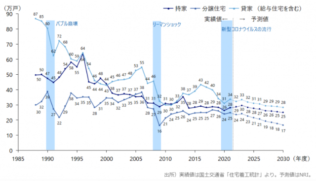 野村総研は、既存住宅流通量やリフォーム市場規模は「増加の見通し」としつつも、現状の延長線上では、「増加幅は新設住宅着工戸数の減少分を補うほどの規模とはならない」と指摘。「非住宅への転用促進など新たな観点も取り入れた創意工夫が必要」とした。