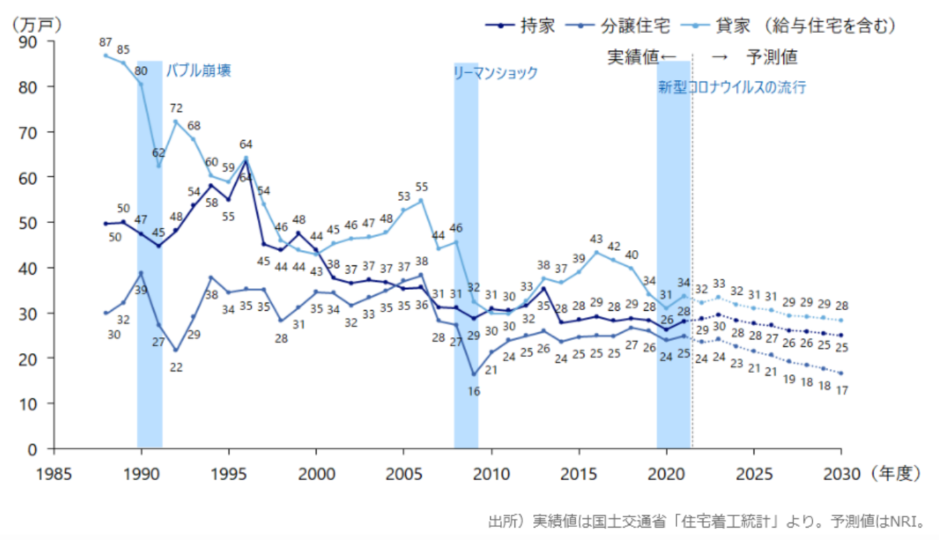 「2022~2040年度の新設住宅着工戸数」について、2030年度は利用関係別に見ると、持家25万戸、分譲住宅17万戸、貸家(給与住宅を含む)28万戸といずれも漸減して70万戸になる見込み。2040年度には49万戸に減少するとした。