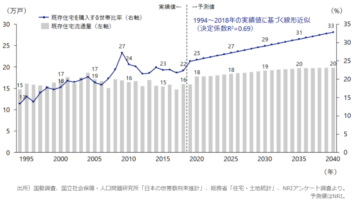 調査では、住宅を購入したすべての世帯のうち既存住宅を購入した世帯の割合は、1994年の13%から2018年には22%と上昇していた。この上昇傾向が継続すると仮定した場合、既存住宅流通量は2018年の16万戸から2030年には19万戸、2040年には20万戸と増加すると見込まれるとした。
