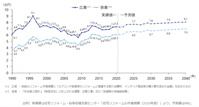 広義のリフォーム市場規模は、2040年まで年間7~8兆円台で微増ないし、横ばい傾向が続くと予測。狭義の市場は、それより1兆円前後少ない規模と見込んだ。