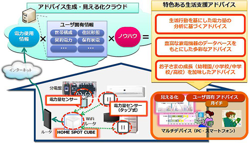 利用者宅内で、高精度の電力量センサーを設置することで、使用電力量や太陽光発電量を「見える化」し、節電効果をパソコンやスマートフォンから確認することができる。また、子どもの成長に応じた家電機器の買い換え時期やおすすめの家電タイプなど暮らしのアイデアも提案する。
