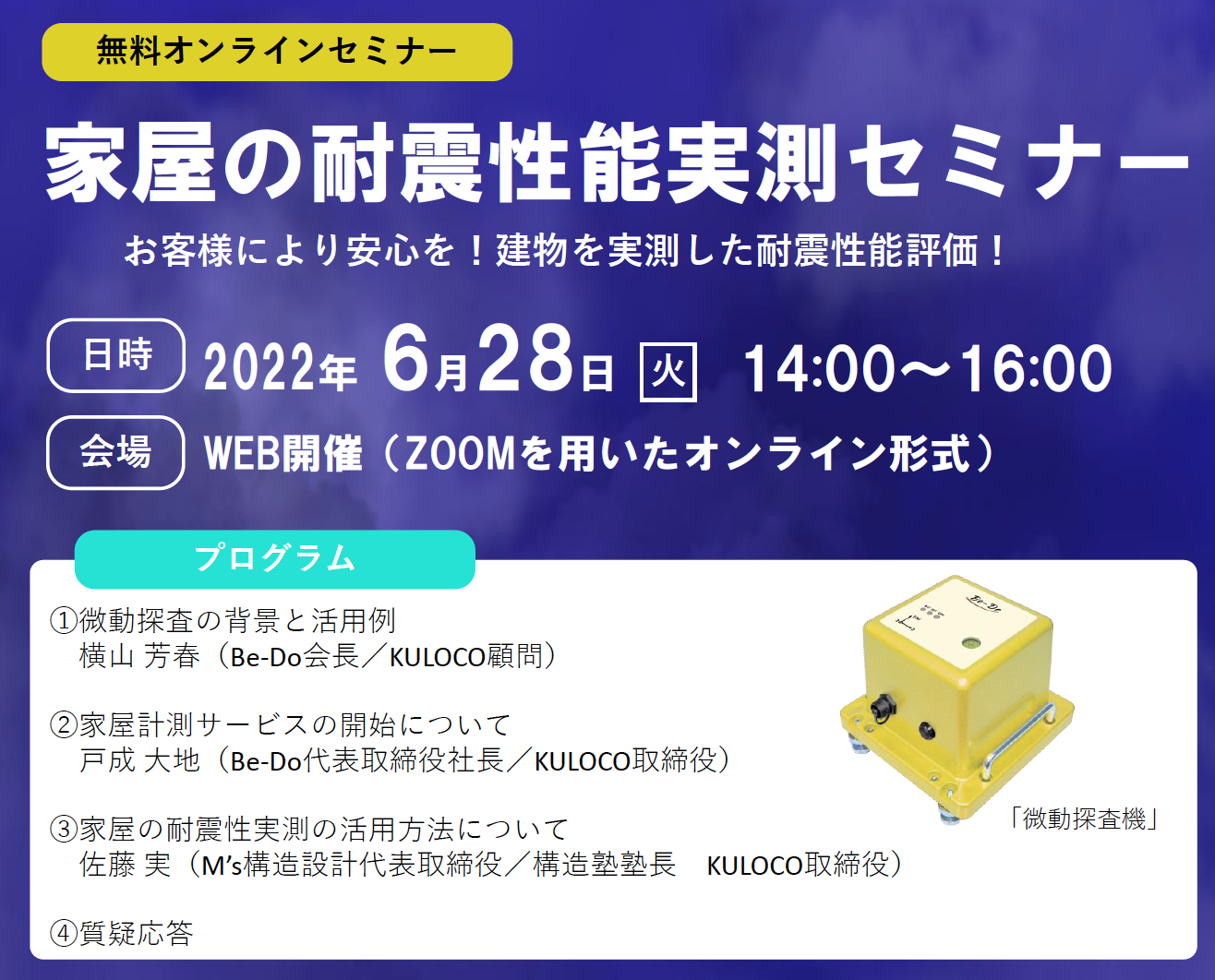 住宅防災の調査・計測業務を手がけるビィードゥ(東京都台東区)は、新たに「微動探査」手法を使って地盤の揺れやすさや家屋の耐震性能を実測するサービスについて解説するオンラインセミナーを6月28日(火)14時〜16時まで開催する。