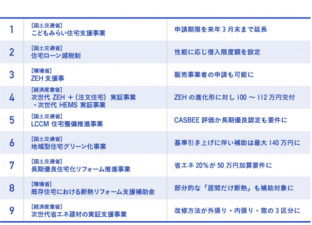 2022年度も、継続・新規合わせてさまざまな支援策が講じられる。今年度は継続事業でも省エネ性を中心に要件の変更が目立ち、新事業でも高性能住宅を優遇する動きは明らかだ。ポイントごとに実際の事業をピックアップしながら、注意点を解説する。