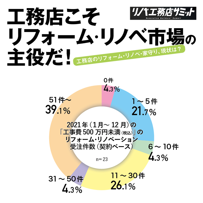 規模は小さくてもニーズの高い小規模(500万円未満)のリフォームは、地域に密着した工務店も重要な担い手だ。回答者の大部分は新築と並行してリフォーム・リノベーションも受注しており、年間50件超の工務店も4割近い。ただし、年10件以下も四分の一を占めるなど、新築・大規模重視の姿勢も垣間見える。(荒井)