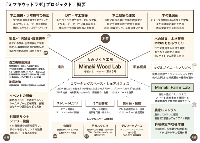 ミマキウッドラボは木造2階建て・延べ床面積約500m2の規模で、本社や製材所の目の前にある敷地に建てる。近く着工し、9月中にオープンする予定だ。木工作業をはじめ鉄工、電子工作・ロボットプログラミング、手芸など、さまざまなものづくりを行うことができるレンタルスペース「ものづくり工房」をメインに、コワーキングスペースやシェアオフィス、音楽・撮影スタジオ、カフェキッチン、小ホール、「木の遊び場」といった多彩な機能を備える。