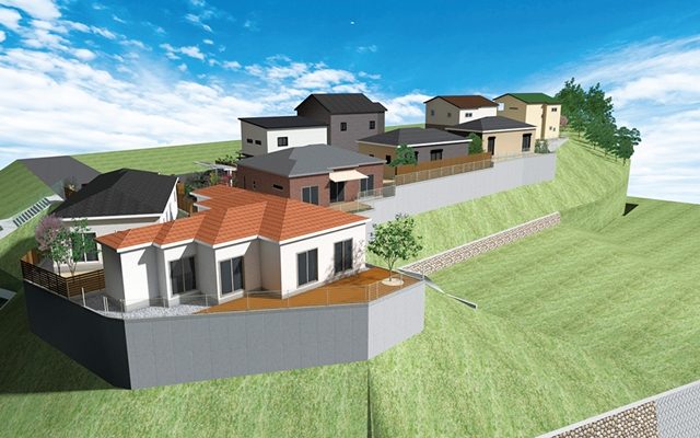 分譲地5区画の全体像(パース)。時期をずらし、約3カ月間モデルハウスとして運用した