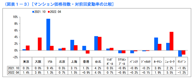 「ニューヨーク」では、オフィス出勤再開によって都心部に居住環境を求める実需層が拡大。市況回復に加え、金利先高感を背景にマンション価格の上昇ペースが加速した。「台北」では、インフレ傾向や建築コストの上昇懸念等がマンション価格の上昇につながった。「ソウル」では金利の引き上げや大統領選挙に対する様子見姿勢が広がり、1.3%増と価格上昇幅が鈍化した。