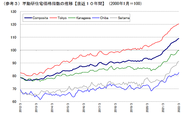 東京都が120.34ポイント(同0.28%増)で23カ月連続、神奈川県が99.93ポイント(同0.60%)で4カ月連続、千葉県が82.49ポイント(同1.84%)で2カ月連続、埼玉県が91.34ポイント(同0.73%)で、13カ月連続上昇している。