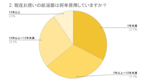 現在使っている給湯器は何年間使用しているか聞いたところ「5年未満」が32.5%、「5年以上~10年未満」が31.5%、「10年以上~15年未満」が26.5%、「15年以上」が9.5%となった。