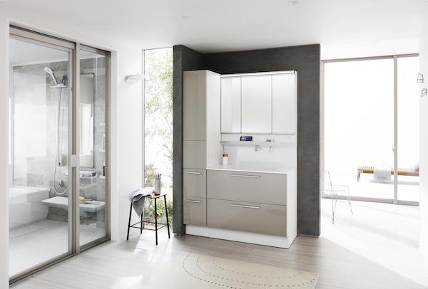 手洗い・洗顔時にメガネやスマートフォンを一時置きできる「ちょい置きカウンター」で使い勝手を高め、凹凸の少ないすっきりとしたデザインにもこだわった。税込32万5160円〜。