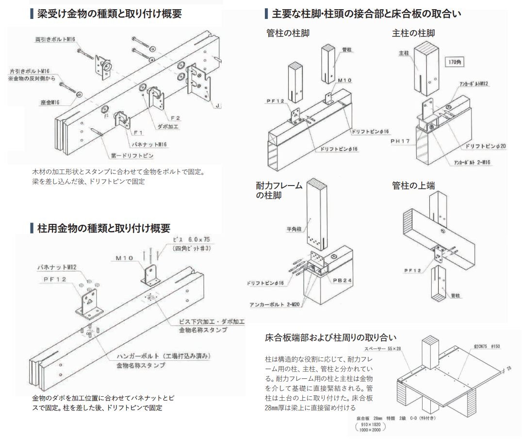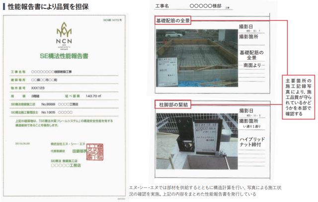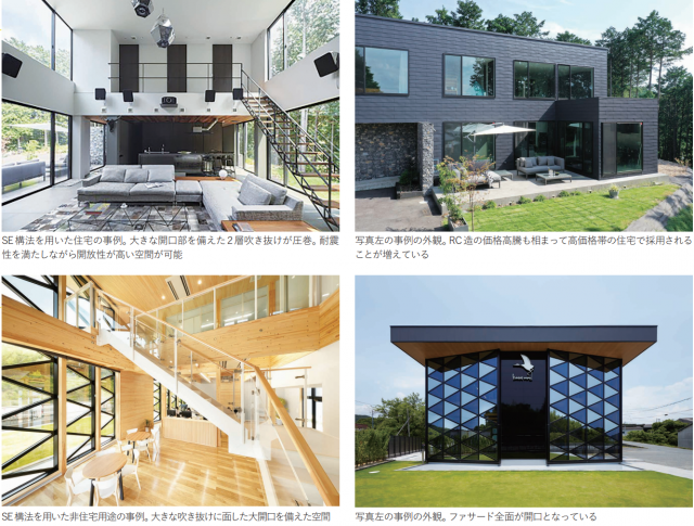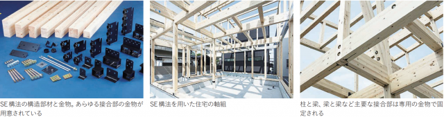 ◉「SE構法」(エヌ・シー・エヌ)も名高い。SE構法は耐力壁を併用した木質ラーメン構法。独自のSE金物と表面に凹凸のあるS ボルトにより構造用集成材の柱と梁を強固に固定