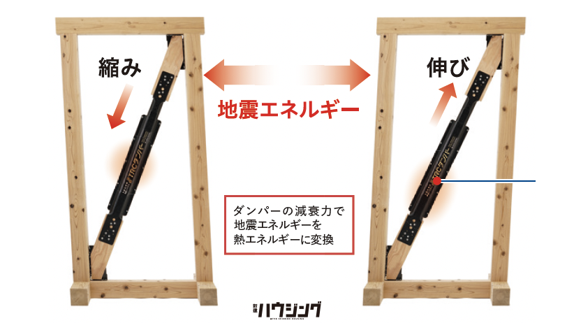 左:テクノビームを利用した門型フレーム「Mフレーム」。狭小敷地などで耐力を確保しつつ開口を確保、右:制震部材「テクノダンパー」。プランによっては、大地震時に一般的な在来工法との比較で大幅に変形を抑える
