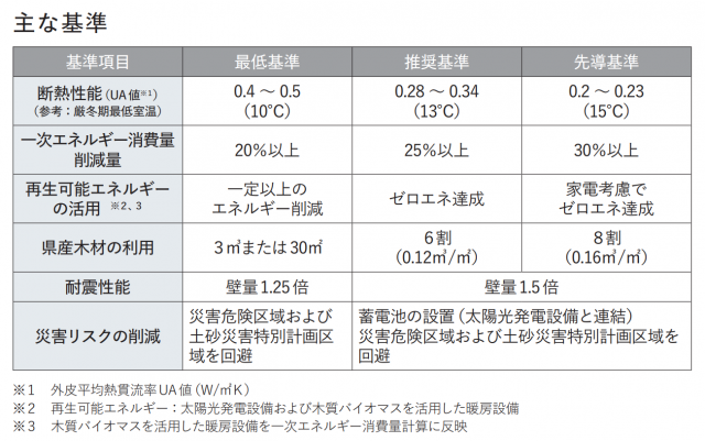 このほか、県産木材の使用量に基づく基準や太陽光発電、木質バイオマスによる暖房、耐震性能や災害リスクの削減量なども同3基準ごとに設定。これらを達成することで、「光熱費が安い」「健康で快適」「災害にもしなやか」「豊かな暮らしを実現」といったメリットにつながるとする。