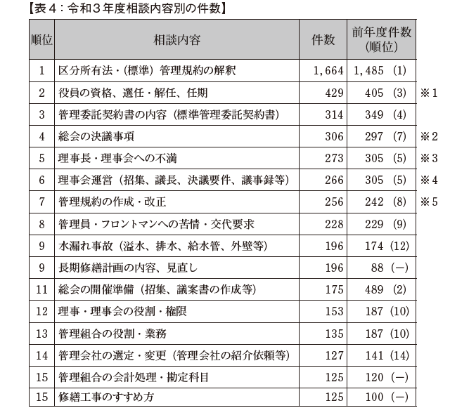 相談内容は、「区分所有法・(標準)管理規約の解釈」が1664件、「役員の資格、選任・解任、任期」429件、「管理委託契約書の内容(標準管理委託契約書)」が314件で、上位3位までで全体の約25%を占めた。前年度は新型コロナ感染拡大の状況のなか、定期総会開催の有無や開催時の留意点、ITを活用した開催が可能かなど、「総会の開催準備(招集、議案書の作成等)」に関する相談が多く寄せられ2位となったが、今回は11位と大幅に減少。2021年6月に公表された改正マンション標準管理規約の規定等により、ITを用いて総会を開催できること等が明確化されたことが要因の1つと考えられる。