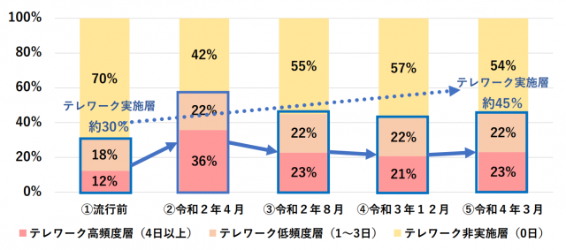 テレワークに関して、週1日以上テレワークを実施する層は、①新型コロナ流行前は約30%だったが、②最初の緊急事態宣言中は約58%に大きく増加、③第1回緊急事態宣言解除後に約45%に減少するものの、その後は④2021年12月は約43%、⑤2022年3月は約45%と、新型コロナ流行前と比較して増加し、定着している様子が伺えた。