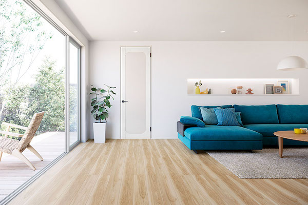 新しいライトグレージュ柄は、選びやすいカラーを揃えた「Skism S」の片開きドア、クロゼット、シューズボックス、フローリング(ツキ板、シート)、室内階段セットにラインアップ。
