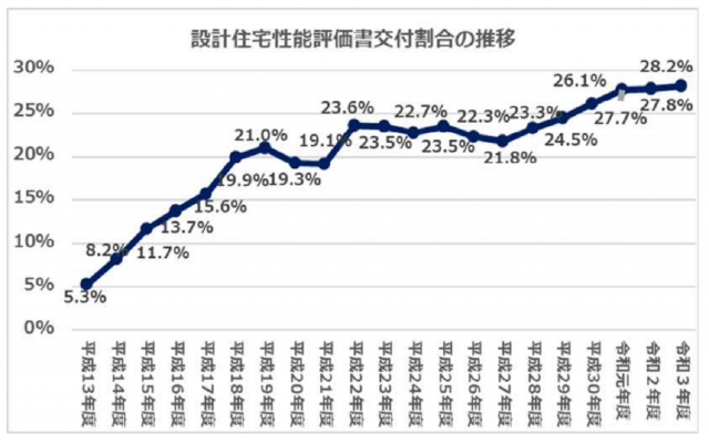 新設住宅着工戸数(86万5909戸)に対する設計住宅性能評価書の交付割合は28.2%で、6年連続の増加となった。
