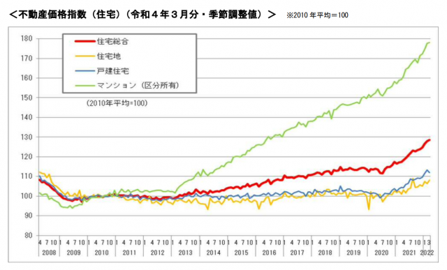 国土交通省は6月30日、2022年3月分の不動産価格指数(季節調整値)を公表した。2010年平均を100として算出したもので、全国の住宅総合は前月比0.6%増の128.6となった。住宅地は同1.6%増の108.2、戸建住宅は同1.1%減の112.0、マンション(区分所有)は同0.2%増の178.1だった。