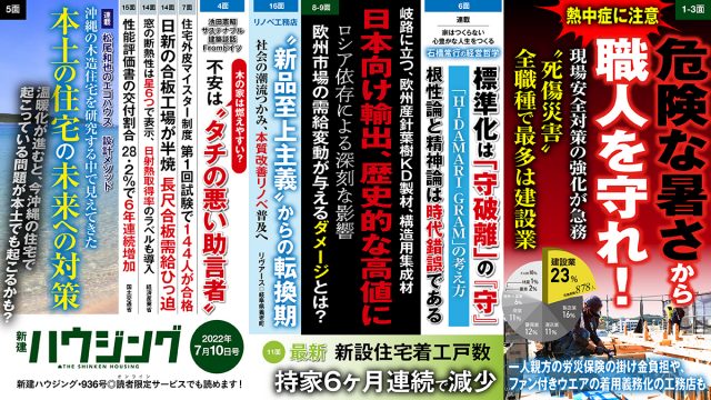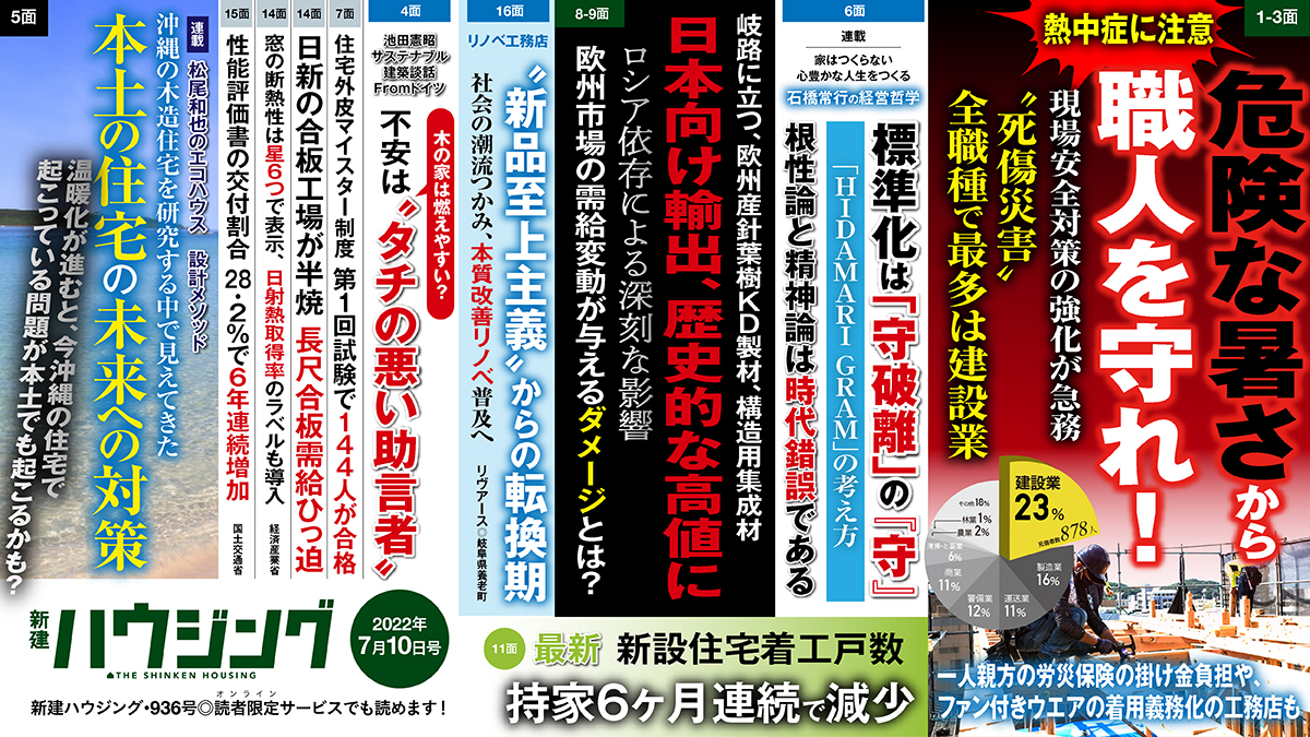 異例の早さとなった梅雨明けで厳しい暑さが本格化する中、危険と隣り合わせの炎天下でも、現場を止めることはできません。職人たちの安全確保はどうしたら良いのか。いますぐに現場における安全対策を徹底的に見直し、強化を図る必要があります。本紙最新7月10日号1~3面では、行政、工務店、メーカーに取材し、現状と対策を追いました。