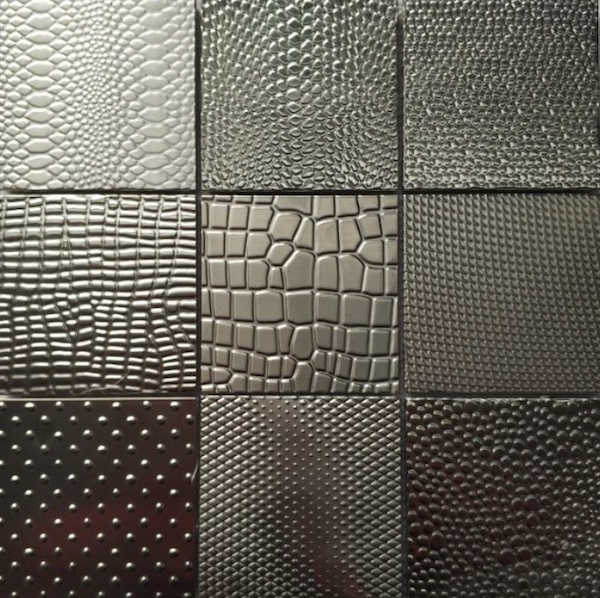 9種類のエキゾチックレザーのテクスチャーをステンレス(SUS304)で表現。金属でありながら、リアルな皮革を思わせるようなディテールが特徴という。基材は磁器質タイルで、プレスしたステンレスを被せている。