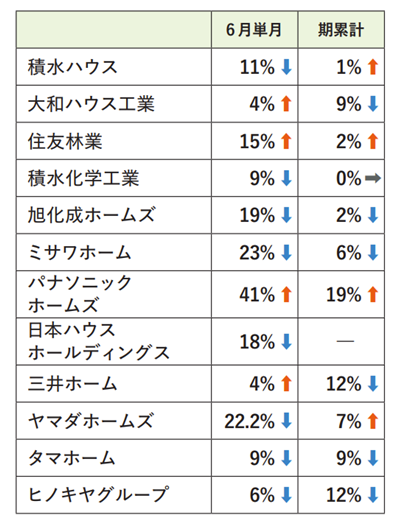 ハウスメーカー各社が7月12日までに6月の戸建て注文住宅の受注速報値(積水化学工業のみ棟数ベース、旭化成ホームズは集合も含む)を発表した。それによると、前年同月比で増加したのは12社中4社にとどまった。大和ハウスは昨年8月以来の増加。減少した8社の内、5社が2ケタ減となり、ミサワホーム、ヤマダホームズは2割以上減少した。両社とも先月が大幅に増加したための反動もあったとみられる。ミサワホームは期累計でも減少に転じた。
