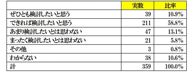 この「興味がある」「とても興味がある」と回答した人のうち、住まいの建て替え・新築の際にパッシブデザインの住まいの検討について聞いたところ、7割以上が検討したいと回答した(「ぜひとも検討したい」10.9%、「できれば検討したい」58.8%)(下表)。