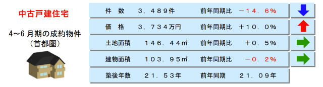 首都圏の中古戸建の成約件数は3489件(前年同期比マイナス14.6%)の2ケタ減。新規登録件数は1万2567件となった。成約価格は前年同期比プラス10.0%・3734万円で、8期連続で前年同期を上回った。前期比も1.4%上昇。新規登録価格は4345万円(前期比プラス4.0%)。