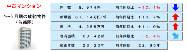 中古マンションの成約件数は8974件(前年同期比マイナス10.1%)。成約m2単価は67.14万円(同プラス13.7%)で8期連続で前年同期比プラス。成約価格は4258万円(同プラス11.0%)で39期連続で前年同期を上回った。