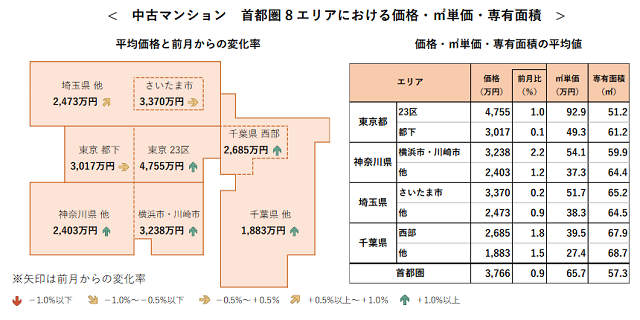 首都圏全体の1戸あたりの平均価格は3766万円で、前月比0.9%上昇。5エリアで上昇率が1.0%以上となっている。8エリア全てで12カ月連続前年同月超えとなり、2021年7月以降の最高額を更新。上昇傾向が継続している。
