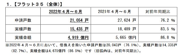 住宅金融支援機構(東京都文京区)が7月29日発表した2022年4月~6月の「フラット35」申請戸数は、全体が前年同期比76.2%の2万1054戸、実績戸数は同83.5%の1万5435戸、実績金額は同86.8%の4919億円だった。