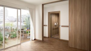 新たに、操作ボタン・手すり・床に抗菌・抗ウイルス処理をほどこし、デザインをリニューアルして全機種の乗り場ドアに内装建材「ベリティス」で人気の色柄2種類(イデアオーク、グレージュアッシュ)を追加。さらに、ドア窓を縦3連小窓から大型窓に変更して開放感と視認性を高め、ロープ式機種は下降速度を高速化して利便性を向上した。