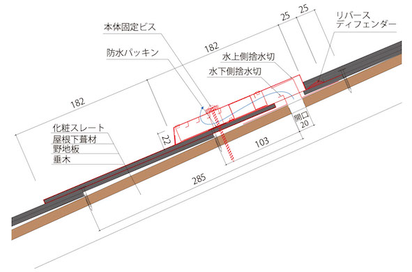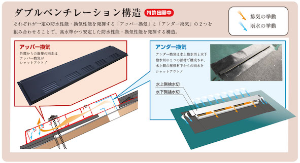 従来品は、ゲリラ豪雨のように短時間で強い雨が降った場合、屋根材から浸入した雨水が捨て水切りの水上側に溜まってオーバーフローする可能性があったため、新たに「ダブルベンチレーション構造」(特許出願中)を開発。それぞれが一定の防水・換気性能を発揮する「アッパー換気」「アンダー換気」の2つ換気部材を組み合わせることで、ゲリラ豪雨時にも安定した防水・換気性能が期待できるとする。