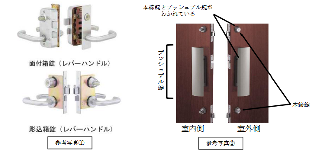 ハンドルと本締錠が一体となった箱錠(左)、マンションの標準仕様となっているプッシュプル錠と本締錠が分かれているタイプ(右)