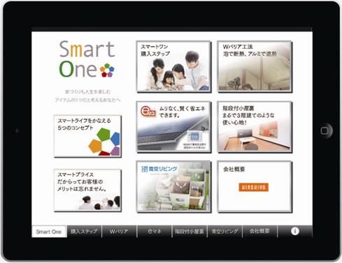 会社概要、「スマートワン」の商品コンセプト・メリットをはじめ、低価格に抑えられる理由や購入ステップなどをiPadの直感操作で伝えるアプリ。外壁カラーシミュレーション、現場発泡断熱材の施工ムービー、建物の隅々まで確認できる360度ビュー、ソーラーシステム+HEMSによる独自のエネルギー見える化「e-マネ」による光熱費0円シミュレーションなど、紙のカタログでは説明が難しかった特徴を動画などを使って解説する。